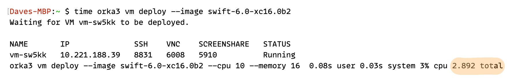 If you had asked me whether this would be practical before we tried Orka, I’d have guessed that the overhead of spinning up hundreds of thousands of VMs per week would be prohibitive, so we were delighted when we first chatted with MacStadium about Orka to be told virtual machines start in a few seconds. We were even more delighted when “a few” seconds turned out to be less than three: